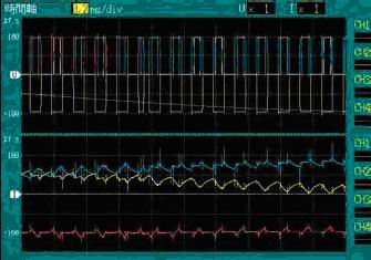 此外,3390還具備以X-Y圖表顯示來確認(rèn)變頻器的動(dòng)態(tài)特性的功能,變頻器不可或缺的諧波測(cè)量功能,用FFT評(píng)估影響變頻器的干擾的功能(可達(dá)100kHz)等(圖2)。而且,利用3390的500k采樣/秒的高速采樣率,來顯示電壓/電流波形(圖3)。之前,需要使用數(shù)字示波器和差分探頭、鉗式電流傳感器來觀測(cè)波形,非常麻煩,現(xiàn)在1臺(tái)3390即可實(shí)現(xiàn)。