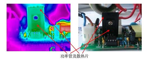 大的器件,所以必須加裝散熱片使其長期穩(wěn)定工作溫度不超過120℃;在拍攝熱圖時(shí),散熱片是鋁合金材料經(jīng)過發(fā)黑處理,其表面雖然為黑色但其發(fā)射率還是較低,建議用油漆筆涂黑后進(jìn)行檢測,或在溫度穩(wěn)定一段時(shí)間后直接測量功率管的溫度。