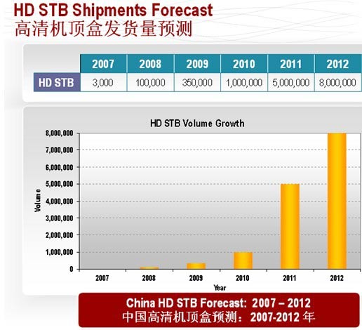 此外,博通特別對(duì)高清機(jī)頂盒市場(chǎng)做了分析。寬帶通訊事業(yè)部資深市場(chǎng)總監(jiān)JohnGleiter說,由于政府大力推進(jìn)高清內(nèi)容進(jìn)入消費(fèi)者市場(chǎng),預(yù)示著中國(guó)的高清機(jī)頂盒產(chǎn)業(yè)正式破冰啟航。與此同時(shí),廣電總局要求的九套免費(fèi)高標(biāo)清同播的衛(wèi)視節(jié)目將從現(xiàn)在開始不斷完善。在總局內(nèi)容高清化的時(shí)間表中,到2010年,這五套衛(wèi)視的所有節(jié)目都需實(shí)現(xiàn)高、標(biāo)清同播,這就打開了之前制約高清電視發(fā)展的內(nèi)容瓶頸。而高清平板電視機(jī)的普及更為高清大發(fā)展迎來了契機(jī)。目前70%的平板電視機(jī)是高清或全高清兼容的,這就意味著購買高清電視機(jī)的消費(fèi)者將成為運(yùn)營(yíng)商挖掘的潛在用戶。單一的數(shù)字化整轉(zhuǎn)運(yùn)營(yíng)商需要大量的成本投入,現(xiàn)在很多運(yùn)營(yíng)商將未來的盈利模式都鎖定在高清和互動(dòng)兩個(gè)方面,所以未來可能有更多的運(yùn)營(yíng)商考慮“高清轉(zhuǎn)換”,這就帶來了有線高清機(jī)頂盒將在2010年大幅增長(zhǎng)的趨勢(shì)。In-Stat預(yù)測(cè),到2010年末將交付50萬臺(tái)先進(jìn)的有線電視機(jī)頂盒,這些機(jī)頂盒都將具有高清處理能力。