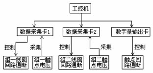 需要注意的是,當觸點電壓為交流信號時,為了保證電壓有效值的計算精度,采集卡在一個工頻周期內(nèi)要完成16個采集通道至少320次的AD轉(zhuǎn)換,這就要求采集卡的采集速率非常快,本裝置采用的是研華的PCL-818HG。每塊采集卡還提供了一個20-PIN數(shù)字輸出口,用來控制試品線圈回路的通斷電。試品觸點回路采用一塊多通道的數(shù)字量輸出卡,通過固態(tài)繼電器實現(xiàn)對兩組試品觸點回路的通斷電控制。繼電器可靠性檢測裝置的結(jié)構(gòu)框圖如圖1所示。