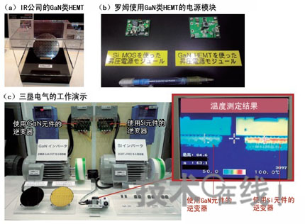 為了降低成本,使用Si底板的展出接連不斷。IR展出了形成有GaN類HEMT的晶圓(a)。羅姆也首次試制使用Si底板的GaN類HEMT并展出了電源模塊(b)。三墾電氣使用配備有6個SBD內置GaN類FET的逆變器驅動200V、2.2kW的3相交流馬達,與利用配備Si制IGBT和FRD的逆變器進行驅動時逆變器表面溫度的變化進行了比較(c)。左側配備GaN元件的逆變器損失小且溫度低。美國國際整流器公司(International Rectifier,IR)宣布在2009年內投入實用。首先投產的將是使用耐壓僅為數十V的GaN類HEMT的POL電源模塊,為無需加載柵極電壓即可導通的“常開”型。