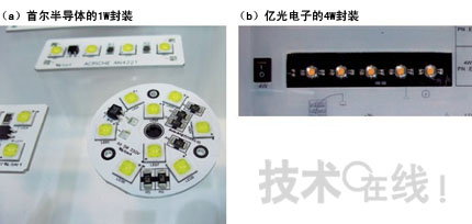 對于備受關注的高效照明——LED,能夠利用交流電源的種類越來越受到重視(圖3)。這種類型的LED照明無需A-D轉換電路,有望實現照明的小型化。該類型的先驅者——韓國首爾半導體(Seoul Semiconductor)展出了新產品:功耗為1W等級的封裝好的產品。過去該公司一般提供2W/4W等級的大型封裝產品,此次展示是為了滿足市場對于小型、高易用性的1W級別產品的需求。該產品的發(fā)光效率為70~80lm/W,低于直流電源驅動的類型,但韓國首爾半導體表示:“到2010年,其效率將提高到與直流驅動產品相當的程度(100lm/ W以上)”。