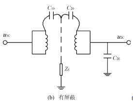 由于C2是屏蔽層的對(duì)地阻抗,在低頻范圍內(nèi),ZE《(1/jωC10),所以u(píng)2C→0。由此可見,采取屏蔽措施后,通過(guò)隔離變壓器的共模噪聲電壓被大大地削弱了。