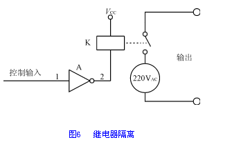 繼電器是常用的數(shù)字輸出隔離元件,用繼電器作為隔離元件簡(jiǎn)單實(shí)用,價(jià)格低廉。圖6是繼電器輸出隔離的實(shí)例示意圖。在該電路中,通過(guò)繼電器把低壓直流與高壓交流隔離開來(lái),使高壓交流側(cè)的干擾無(wú)法進(jìn)入低壓直流側(cè)。