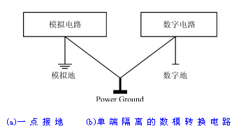 一般地說(shuō),模擬電路與數(shù)字電路之間的轉(zhuǎn)換通過(guò)模數(shù)轉(zhuǎn)換器(A/D)或數(shù)模轉(zhuǎn)換器(D/A)來(lái)實(shí)現(xiàn)。但是,若不采取一定的措施,數(shù)字電路中的高頻振蕩信號(hào)就會(huì)對(duì)模擬電路帶來(lái)一定的干擾,影響測(cè)量的精度。為了抑制數(shù)字電路對(duì)模擬電路帶來(lái)的高頻干擾,一般須將模擬地與數(shù)字地分開布線,參見圖7(a)。這種布線方式不能徹底排除來(lái)自數(shù)字電路的高頻干擾,要想排除來(lái)自數(shù)字電路的高頻干擾,必須把數(shù)字電路與模擬電路隔離開來(lái),常用的隔離方法是在A/D轉(zhuǎn)換器與數(shù)字電路之間加入光電耦合器,把數(shù)字電路與模擬電路隔離開,參見圖7(b)。但這種電路還不能從根本上解決模擬電路中的干擾問(wèn)題,仍然存在著一定的缺陷,這是因?yàn)樾盘?hào)電路中的共模干擾和差模干擾沒(méi)有得到有效的抑制,對(duì)于高精密測(cè)量的場(chǎng)合,還不能滿足要求。對(duì)于具有嚴(yán)重干擾的測(cè)量場(chǎng)合,可采用圖7(c)所示的電路。在該電路中,把信號(hào)接收部分與模擬處理部分也進(jìn)行了隔離,因?yàn)樵谇爸锰幚砑?jí)與模數(shù)轉(zhuǎn)換器(A/D)之間加入線性隔離放大器,把信號(hào)地與模擬地隔開,同時(shí)在模數(shù)轉(zhuǎn)換器(A/D)與數(shù)字電路之間采用光電耦合器隔離,把模擬地與數(shù)字地隔開,這樣一來(lái),既防止了數(shù)字系統(tǒng)的高頻干擾進(jìn)入模擬部分,又阻斷了來(lái)自前置電路部分的共模干擾和差模干擾。當(dāng)然,這種系統(tǒng)的造價(jià)較高,一般只用于高精度的測(cè)量系統(tǒng)中。