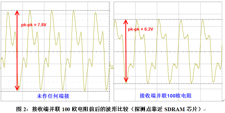 幾天后,我們在實驗室重新測試了該系統(tǒng)的時鐘,測試儀器為SDA816Zi(帶寬16G,采樣率40G),探頭為ZS1500(帶寬1.5GHz)。由于待測試信號頻率僅為100MHz,所以通常1G以上示波器和探頭足以滿足需求(注:對于某些上升時間很快的時鐘,比如PCIExpress的100MHz時鐘,1GHz的帶寬是不夠的,需要更高帶寬的示波器)。下圖2左圖為未作端接時在SDRAM芯片端測量時鐘波形,右圖為靠近SDRAM顆粒并聯(lián)100歐電阻后的波形,兩者相比,前者的過沖高達7.8V,電路板不能正常工作;而后者過沖較小,電路板可以正常工作。