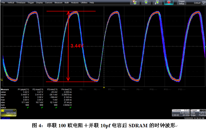 由于電路中ARM的MCU輸出的一路100MHz時鐘要驅動兩個SDRAM芯片,布線上MCU出來的時鐘剛出來就分成兩路后連向兩個SDRAM的時鐘引腳,所以我們采用了在兩路時鐘分支上同時串聯(lián)100歐電阻加并聯(lián)10pf電容的端接方法。在PCB上割線,焊上電阻和電容后測量的結果如下圖4所示,改進后的時鐘峰峰值為3.44V,波形無過沖,信號質量良好。電路板系統(tǒng)運行正常。