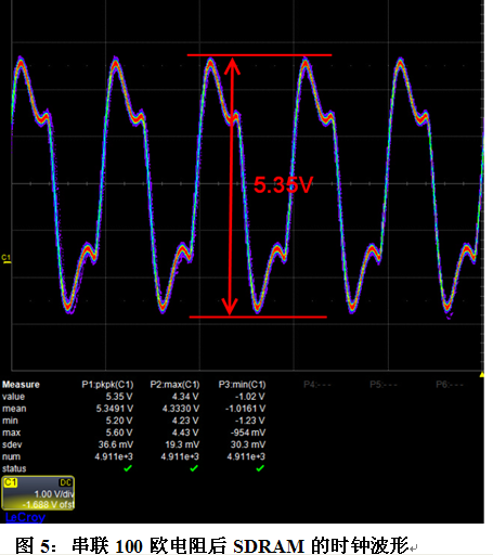 下圖5所示為只串聯(lián)100歐電阻時測量到的波形,信號有過沖,峰峰值為5.35V,偏大,對比圖4的端接方法,串聯(lián)電阻加上并聯(lián)電容是較好的解決方法。