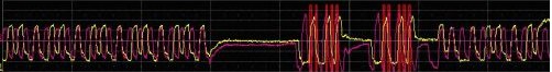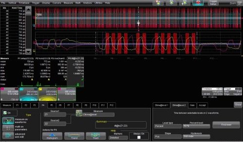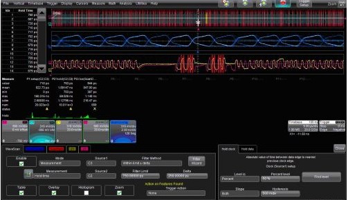 WaveScan把測量過濾中所有符合測量標(biāo)準(zhǔn)的波形累積起來形成掃描疊加的軌跡圖(圖2中間的軌跡)。這幅余輝圖包含了全部捕獲的歷史波形軌跡。我們現(xiàn)在就可以對被選擇出來的整個(gè)波形組在掃描疊加軌跡圖上應(yīng)用測量參數(shù)進(jìn)行測量。你也可以在被選擇波形的縮放軌跡上應(yīng)用測量參數(shù)進(jìn)行測量。