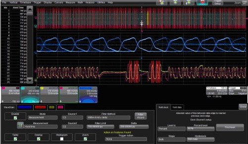 力科的WaveScan波形搜索與掃描特性可以通過選擇Strobe和掃描疊加(ScanOverlay)圖中滿足條件的波形之間的時(shí)序關(guān)系找出Data信號。圖2是這種功能的一個(gè)例子。WaveScan的對話框設(shè)置為搜索建立時(shí)間(Hold Time)在500ps到1ns(750 ±250 ps)之間的波形。對話框右邊的標(biāo)簽用來鑒別Strobe和Data信號。注意“Hold Clock”和“Hold Data”兩個(gè)對話框標(biāo)簽,測量是對這兩個(gè)信號邊沿設(shè)定的。