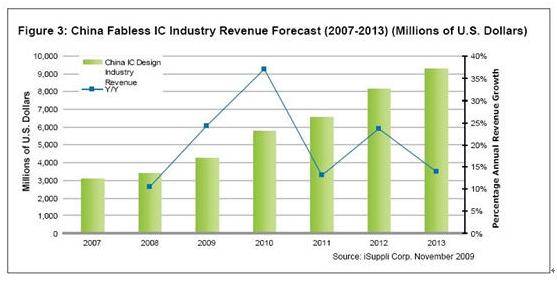 在金融危機影響下全球半導(dǎo)體業(yè)最新的預(yù)測是下降12%。在中國獨特的環(huán)境下按iSuppli的預(yù)測,2009年中國半導(dǎo)體市場下降6.8%及其設(shè)計業(yè)將增長24.2%,達到42億美元。這個數(shù)字占全球fabless約 500億美元的8%,及占中國半導(dǎo)體業(yè)銷售額,09年約1118億元的25.6%,可謂是取得不差的成績。