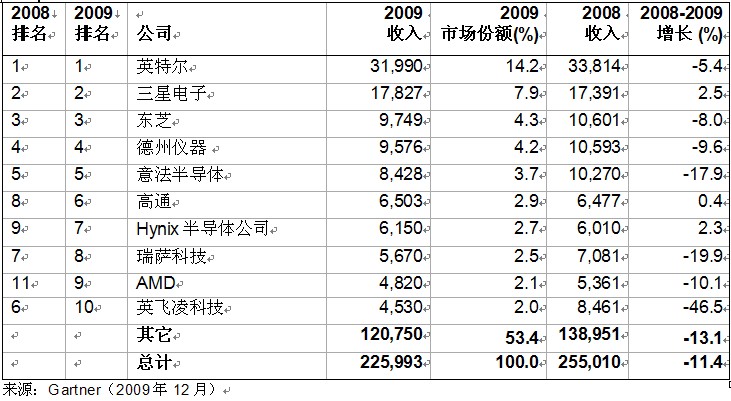 盡管收入下滑,英特爾公司連續(xù)18年來收入蟬聯(lián)首位。2009年,該公司的市場份額增加到14.2%。
