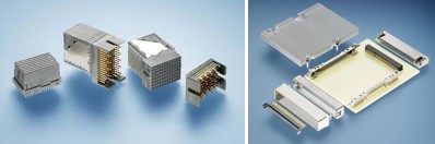 圖2:泰科電子的全新85 歐姆連接器套件(左)以及40Gb/s和100Gb/s以太網(wǎng)熱插拔解決方案(右)