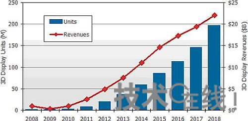 目前,3D(三維)顯示器非常引人注目。最新發(fā)布的《3D顯示器技術(shù)&市場調(diào)查報告》預測,3D顯示器市場的供貨量和供貨金額將從2008年的70萬臺、9億200萬美元增長至2018年的1億9600萬臺、220億美元(圖1)。如果市場果真按照該預測增長的話,年均復合增長率(CAGR)按金額計算將達到38%,按數(shù)量計算將達到75%。