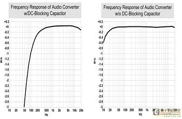 用來隔離DC電流的最常見技術(shù)是采用去耦電容,如圖1所示。在信號路徑中放置一個電容可以創(chuàng)建一個高通濾波器,其角頻率由耳機(jī)阻抗(R)和去耦電容(C)設(shè)置,等于1/(2πRC)。通常人的耳朵能夠聽到聲音頻率最低為20Hz。根據(jù)這個下限和耳機(jī)的典型阻抗,可很容易地計算出所需的電容值。對于20Hz的角頻率,電容容值取500uF。