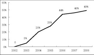 自2003年啟動(dòng)半導(dǎo)體照明工程和“十一五”863重大項(xiàng)目實(shí)施以來,我國(guó)LED外延材料、芯片制造、器件封裝、熒光粉等方面均已顯現(xiàn)具有自主技術(shù)產(chǎn)權(quán)的單元技術(shù),部分核心技術(shù)具有原創(chuàng)性,初步形成了從上游材料、中游芯片制備、下游器件封裝及集成應(yīng)用的比較完整的研發(fā)與產(chǎn)業(yè)體系,為我國(guó)LED產(chǎn)業(yè)做大做強(qiáng)在一定程度上奠定了基礎(chǔ)。目前我國(guó)芯片企業(yè)產(chǎn)業(yè)化線上完成的功率型芯片封裝后光效超過90lm/W。具有自主知識(shí)產(chǎn)權(quán)的功率型硅襯底led芯片封裝后光效達(dá)到78lm/W,處于國(guó)際先進(jìn)水平。根據(jù)國(guó)家半導(dǎo)體照明工程研發(fā)及產(chǎn)業(yè)聯(lián)盟統(tǒng)計(jì),從2004年開始國(guó)內(nèi)LED產(chǎn)業(yè)累計(jì)新增投資規(guī)模達(dá)150億元,最近連續(xù)3年,每年企業(yè)訂購(gòu)并安裝投入的MOCVD數(shù)量超過50臺(tái)以上,國(guó)產(chǎn)化率大幅提高,截止2008年底,芯片國(guó)產(chǎn)化率達(dá)到49%(見圖1)。按照目前聯(lián)盟成員單位的擴(kuò)產(chǎn)計(jì)劃和機(jī)臺(tái)訂單數(shù)量,預(yù)計(jì)未來3年國(guó)內(nèi)將增加MOCVD近兩百臺(tái)。目前Cree、旭明以及臺(tái)灣芯片廠商都以合資的形式進(jìn)入了國(guó)內(nèi),勢(shì)必進(jìn)一步帶動(dòng)芯片的國(guó)產(chǎn)化。2015年芯片國(guó)產(chǎn)化率有可能達(dá)到70%。