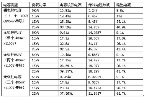 第三個替換試驗是用薄膜電容器替代660V交流輸入電壓變頻器中的鋁電解電容器。由于手頭沒有660V感應電機,負載只能采用電阻箱替代感應電機。其測試結(jié)果列于表3。