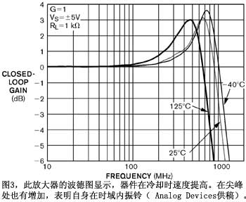 很多放大器,如AnalogDevices的AD8045,在冷卻時(shí)會(huì)加速(圖3),而有些放大器(如AD8099)則在變冷時(shí)會(huì)降速。已退休的LinearTechnology信號(hào)處理產(chǎn)品前副總裁兼總經(jīng)理BillGross稱:“雙極晶體管在低溫下遇到的多數(shù)麻煩是低電壓工作。”他認(rèn)為,較高的基射電壓和較小的電流增益都更難于滿足規(guī)格要求。他說:“較低的輸入阻抗和b(電流增益)的不匹配都會(huì)造成低溫下的大問題。尤其是當(dāng)它們?yōu)槭覝剡\(yùn)行作了調(diào)整時(shí)。較高的gm(跨導(dǎo))很容易通過改變工作電流而得到補(bǔ)償,但這樣的話轉(zhuǎn)換速率就會(huì)變化。”