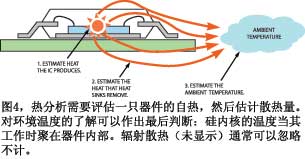 電路的熱分析分三個(gè)步驟。首先估計(jì)IC中產(chǎn)生的熱量。然后,估計(jì)電路板或散熱片散掉的熱量。最后,估計(jì)部件將要運(yùn)行的環(huán)境溫度(圖4)。在估計(jì)元件產(chǎn)生的熱量時(shí),DC分析通常沒什么價(jià)值。一只電壓為1V、流過1A電流的電阻器,會(huì)產(chǎn)生1W的熱量。但是,要估計(jì)交流或未確定的信號(hào)所產(chǎn)生的熱量就比較麻煩。首先,從電源端到接地腳的靜態(tài)電流總是在耗散一個(gè)直流功率。一個(gè)采用10V電源和5mA靜態(tài)