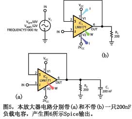 如果你能確定IC通過信號(hào)的特性,就可以用Spice來估算功耗。此時(shí)必須保證使用恰當(dāng)?shù)腟pice模型,它們對(duì)一些測(cè)試信號(hào)給出合理的結(jié)果,而功耗計(jì)算此時(shí)沒有價(jià)值。圖5表示一個(gè)Spice圖。芯片的功耗不同于到達(dá)負(fù)載的功率。圖6是圖5示意圖的Spice曲線圖。它以紅線表示啟動(dòng)的振蕩。電路是否會(huì)發(fā)生這種振蕩只是個(gè)人的猜測(cè),但它應(yīng)該會(huì)使你在建立原型后查看這種行為。記住,在OrcadCapture上點(diǎn)擊W鍵只能顯示芯片的靜態(tài)功耗。要獲得工作時(shí)的功耗,要用示意圖上的功率標(biāo)記,然后用曲線程序的rms-math函數(shù),給出器件的平均功耗。