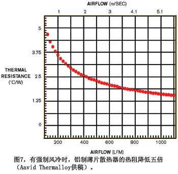 對(duì)流散熱也有一些困難。例如,氣流對(duì)商用散熱片的影響(圖7)。注意,在高溫下,熱阻會(huì)增加五倍。使用強(qiáng)制風(fēng)冷的散熱片有較薄、間距更近的鰭片,比如一款風(fēng)扇式CPU冷卻器。如果你的產(chǎn)品沒有風(fēng)扇,則IC產(chǎn)生的熱量會(huì)傳導(dǎo)和散播出來,然后傳送到機(jī)內(nèi)的空氣中。接下來,隨著整個(gè)機(jī)器溫度的上升,熱量通過對(duì)流傳送給周圍的空氣,如果你把機(jī)器放在腿上,則部分熱量也會(huì)傳導(dǎo)過來。外殼材料的熱阻就變得很重要。熱量從內(nèi)向外的傳送速度,塑料殼要慢于金屬殼。
