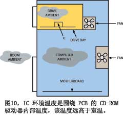 無疑,當(dāng)大多數(shù)工程師沒有理解環(huán)境溫度的嵌套程度時,他們就會失敗。例如,假設(shè)要設(shè)計一個部件,用于CD播放機(jī)的光學(xué)拾取裝置(圖10)。你可能會這么假設(shè),由于該部件用于消費(fèi)產(chǎn)品,它可能工作在0℃~70℃。但好好想想吧。實驗室工作臺上的部件可能是工作在25℃環(huán)境下。而光功率件是要安裝在CD驅(qū)動器里,驅(qū)動器中有其它元件在加熱空氣,該裝置可能不裝風(fēng)扇。更糟糕的是,播放機(jī)裝在計算機(jī)內(nèi),驅(qū)動器必須工作在這種環(huán)境溫度下。計算機(jī)內(nèi)部有自己的熱源和風(fēng)扇,這個溫度上再加上外部環(huán)境溫度,因此,在工作臺上測得的25℃室溫,到了計算機(jī)內(nèi)就是40℃,CD驅(qū)動器內(nèi)是50℃。現(xiàn)在,如果你把計算機(jī)放在厄瓜多爾的一個很熱的閣樓上,情況又該如何?這個部件必須工作在遠(yuǎn)高于70℃的環(huán)境溫度下。你的職責(zé)是確保它仍能滿足規(guī)范,并且高溫不會顯著縮短產(chǎn)品的壽命。