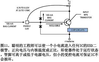 即使當(dāng)器件在電路中工作時,許多聰明的半導(dǎo)體制造商都會自己測量內(nèi)核本身溫度,他們用的是一片IC的每個輸入、輸出和控制腳上都有的ESD(靜電放電)二極管(圖11)。你可以將這種方法用于有復(fù)位或CS(片選)腳的IC,也可以用多個其它腳作測量。由于二極管的正向壓降與電流成正比,你可以將芯片放入烤箱,使小電流通過ESD二極管。業(yè)內(nèi)很多人認(rèn)為,100mA的電流不會造成二極管的任何自熱現(xiàn)象。你不需要為部件加電來測量二極管電壓,你可以用電源腳上或接地腳下的任何輸入或輸出腳。管腳內(nèi)部的ESD二極管會將該腳箝位在大約0.6V。如果是復(fù)位腳,它需要在部件工作時保持高電平,則將該腳上拉到電源腳。當(dāng)烤箱溫度上升時,ESD二極管的正向壓降從大約0.7V降到0.53V。