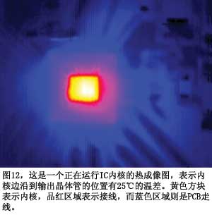 有關(guān)ESD二極管方法的另一個擔(dān)心是,IC芯片并不是等溫的,即它們在空間和時間上都不具備相等或恒定溫度。測量ESD二極管時并不能永遠(yuǎn)保證測到的是內(nèi)核的最熱點。這里關(guān)注的是ESD二極管,它總是在芯片的邊沿,低于輸出晶體管的溫度。你可以獲得IC工作時的IR熱成像圖(圖12)。圖中明亮的白點比ESD二極管所在的內(nèi)核邊沿高25℃。當(dāng)器件工作在高溫下時,可能需要降級使用(參考文獻(xiàn)8)。在150℃時,器件可能不能滿足電路的要求。