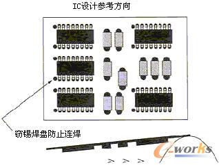 PCB上元器件的布局對生產(chǎn)效率和成本有相當(dāng)重要的影響,是衡量PCB設(shè)計的可裝聯(lián)性的重要指標(biāo)。一般來講,元器件盡可能均勻地、有規(guī)則地、整齊排列,并按相同方向、極性分布排列。有規(guī)則的排列方便檢查,有利于提高貼片/插件速度,均勻分布利于散熱和焊接工藝的優(yōu)化。另一方面,為簡化工藝流程,PCB設(shè)計者始終都要清楚,在PCB的任一面,只能采用回流焊接和波峰焊接中的一種群焊工藝。這點在組裝密度較大、PCB的焊接面必須分布較多貼片元器件時,尤其值得注意。設(shè)計者要考慮對焊接面上的貼裝元件使用何種群焊工藝,最為優(yōu)選的是使用貼片固化后的波峰焊工藝,可以同時對元件面上的穿孔器件的引腳進行焊接;但波峰焊接貼片元件有相對嚴格的約束,只能焊接0603及以上尺寸的片式阻容﹑SOT﹑SOIC(引腳間距≥1mm且高度小于2.0mm)。分布在焊接面的元器件,引腳的方向宜垂直于波峰焊接時PCB的傳送方向,以保證元器件兩邊的焊端或引線同時被浸焊,相鄰元件間的排列次序和間距也應(yīng)滿足波峰焊接的要求以避免“遮蔽效應(yīng)”,如圖1。當(dāng)采用波峰焊接SOIC等多腳元件時,應(yīng)于錫流方向最后兩個(每邊各1)焊腳處設(shè)置竊錫焊盤,防止連焊。