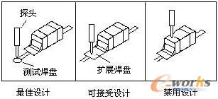 圖6所示為測試點設(shè)計的一個示例。通過延伸線在元器件引線附近設(shè)置測試焊盤或利用過孔焊盤測試節(jié)點,測試節(jié)點嚴禁選在元器件的焊點上,這種測試可能使虛焊節(jié)點在探針壓力作用下擠壓到理想位置,從而使虛焊故障被掩蓋,發(fā)生所謂的“故障遮蔽效應(yīng)”。由于探針因定位誤差引起的偏晃,可能使探針直接作用于元器件的端點或引腳上而造成元器件損壞。