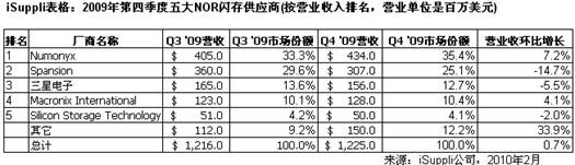 但是,第四季度NOR供應(yīng)商的增長情況并不一致,贏家與輸家之間界限分明。具體來說,Numonyx和Macronix是大贏家,在五大供應(yīng)商中,是2009年第四季度唯一實(shí)現(xiàn)環(huán)比增長的兩家廠商。