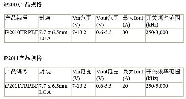 iP2010的輸入電壓范圍為7V至13.2V,輸出電壓范圍則為0.6V至5.5V,輸出電流高達(dá)30A。這個(gè)器件最高運(yùn)行頻率為3MHz。在5MHz運(yùn)行時(shí),與iP2010引腳兼容的iP2011備有相同的輸入和輸出電壓范圍,但后者經(jīng)過優(yōu)化,從而使最高輸出電流高達(dá)20A。通過以通用占位面積提供多種電流額定值器件,IR提供的靈活性能夠滿足不同客戶對(duì)電流水平、性能和成本的要求。