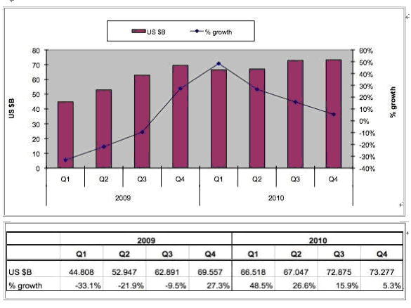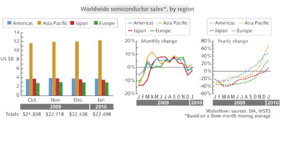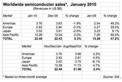 按SIA總裁的看法,全球半導體銷售額1月的最新數(shù)據(jù)(三個月的移動平均值) 比12月的225億美元上升0,3%,分析推動市場增長在眾多方面,包括計算機,手機,汽車電子和工業(yè)應用。如果與去年同期相比,銷售額增長達47%,顯然與09年1月時正值全球的最低點有關(guān)。