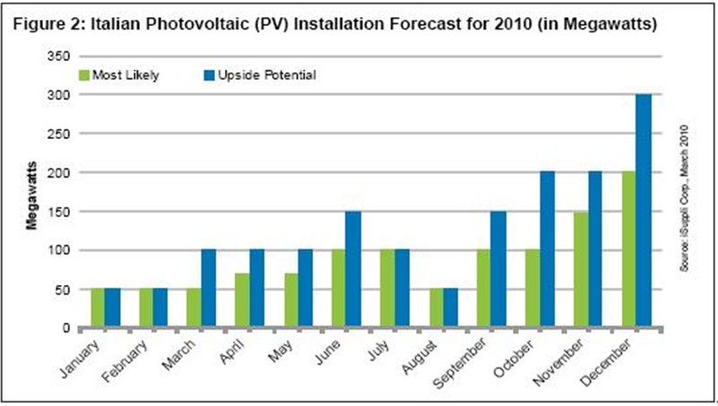 最可能出現(xiàn)的情況是,2010年意大利市場將安裝1.1GW,年終的四個(gè)月需求將會(huì)大增。但是,由于將下調(diào)FIT,意大利2010年安裝容量也很有可能高達(dá)1.5GW。