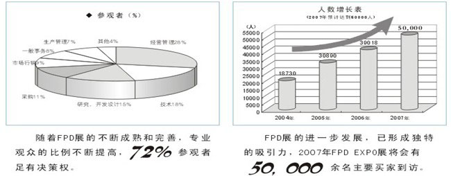 ●“光電平板顯示展”將吸引知名FPD企業(yè)的高管(日立、夏普、三星、LG、友達、華映等)、通路商的高管、政府要員、技術(shù)人員等近五萬人到場,同時組委會將通過國內(nèi)外相關(guān)行業(yè)協(xié)會、商會組織專業(yè)士參觀。