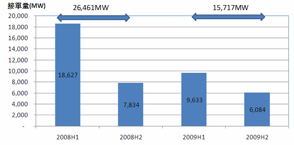 2009年全球風力發(fā)電市場不畏金融海嘯沖擊,在美國及中國政府大力推廣下,新增風力發(fā)電裝置量仍較2008年成長31%。但因2009年新增容量主要來自既有存貨,風力機接訂單量僅為15,717MW,較2008年衰退41%。前瞻2010年,在中、美及歐洲風電大國帶動下,全球風力發(fā)電新增容量將較2009年成長15%;而風力機接單量受到價格驟降及主要風電大國景氣回升影響,可望庫存回補而為2009年的2.2倍。