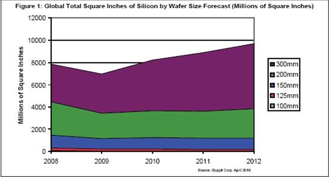 圖1所示為iSuppli公司對2008-2013年硅片面積總產(chǎn)量的預(yù)測,按晶圓尺寸細(xì)分。