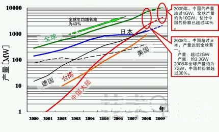 - 2000年以后,全球太陽(yáng)能電池產(chǎn)量以年均40%左右的速度增長(zhǎng)