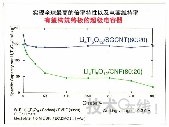東京農工大學研究生院于2009年3月宣布,開發(fā)出了采用碳納米纖維(CNF)與LTO復合而成的負極的鋰離子電容器,與以往的采用活性炭的雙電層電容器相比,實現(xiàn)了約3倍的能量密度。而且還表示,將完善由日本Chemi-Con定于2011年春季樣品供貨采用該技術的鋰離子電容器的體制。