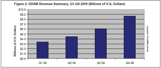 2009年第一季度創(chuàng)下2001年以來的最低營業(yè)收入,DRAM產(chǎn)業(yè)隨后持續(xù)穩(wěn)步改善,第四季度營業(yè)收入達(dá)到87億美元,比第三季度的61億美元?jiǎng)旁?3%。這樣的結(jié)果足以使2009年第四季度成為過去10年來DRAM市場表現(xiàn)最好的五個(gè)季度之一。