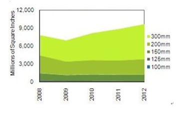 全球硅片市場按出貨面積計(jì), 在2009年下降11%, 而在2010年有望達(dá)到82億百萬平方英寸, 增長17%。其中300mm硅片增長最快為27%,達(dá)45億百萬平方英寸(MSI), 相比較200mm硅片增長7%及150mm硅片在10%以下。
