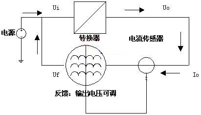 在能量反饋部分就要能實現(xiàn)上述要求,保證穩(wěn)定的電能轉(zhuǎn)換器的輸出電流,采用電流傳感器檢測電能轉(zhuǎn)換器的輸出電流,同時反饋部分采用反饋電壓與輸出控制電流之間成反比系數(shù)關系即Uf∝K/Io,為便于分析,設電源電壓Ui為穩(wěn)定值。當輸出電流較小時,通過調(diào)節(jié)反饋電壓,使其變大,則反饋電壓與輸入的電壓差△U=Uf-Ui變大,相應的由反饋電壓流向輸入電壓的電流加大,造成相應的反饋功率加大;當輸出電流較大時,通過調(diào)節(jié)反饋電壓,使Uf變小,則反饋電壓與輸入的電壓差△U變小,相應的由反饋電壓流向輸入電壓的電流減小,造成循環(huán)的功率減小;整個過程維持負反饋控制,最終達到動態(tài)平衡,維持設定的額定功率。