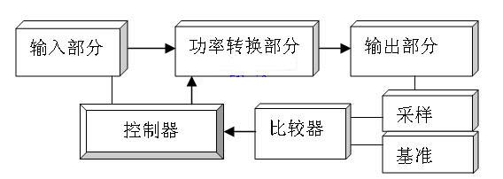 從以上能量反饋系統(tǒng)工作分析可知,能量反饋部分為系統(tǒng)穩(wěn)定工作提供必要的保證,能量反饋部分組成可由圖5所示,主要包括:輸入部分、功率轉(zhuǎn)換部分、輸出部分、采樣、基準、比較器和控制器七個組成部分。