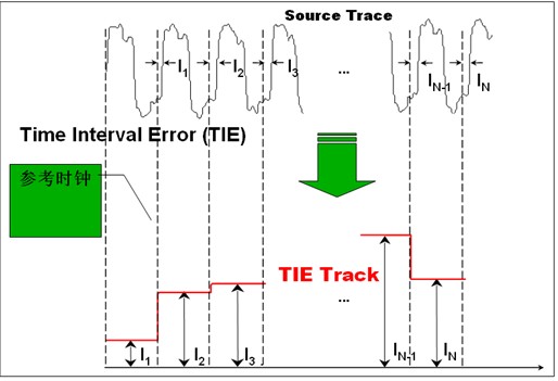在圖2、圖3、圖4中的紅色曲線橫軸是時間,縱軸是對應周期的抖動數(shù)值,該曲線反映了抖動隨時間變化的趨勢,稱為抖動跟蹤(Jitter track);將每個周期的抖動值(比如TIE抖動的I1、I2…In)作統(tǒng)計直方圖,可以得到抖動直方圖(Jitter Histogram);將抖動跟蹤做快速傅立葉變換(FFT)計算可以得到抖動頻譜(Jitter Spectrum)。