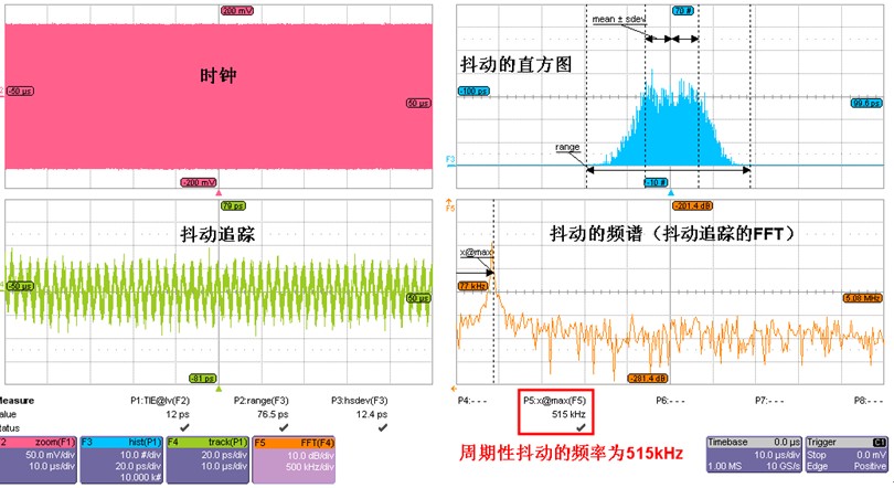 左下角的F4為TIE track(即TIE抖動隨時間變化的趨勢),從TIE Track中可以看到周期性的變化趨勢;右下角的F5是F4的FFT運算,即抖動的頻譜,頻譜的峰值頻率為515kHz,說明該時鐘的周期性抖動(PJ)的主要來源為515kHz,找到頻點后,可以查找電路板上主頻或諧波為該頻率的芯片和PCB走線,進一步調(diào)試與分析。時鐘抖動的分解