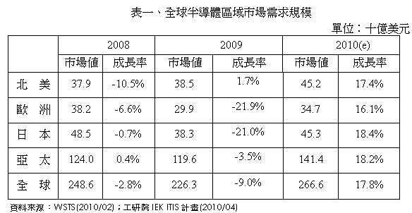 2009年全球半導(dǎo)體市場僅北美地區(qū)微幅成長1.7%,其他皆呈現(xiàn)負(fù)成長:亞太市場衰退3.5%,歐洲市場衰退21.9%,日本市場衰退21.0%。不景氣使得下游電子產(chǎn)品品牌大廠,如Dell、HP、Sony等廠商增加產(chǎn)品委外代工之比例,以降低生產(chǎn)成本,增加其產(chǎn)品競爭力。因此,2009年主要從事代工生產(chǎn)之亞太地區(qū),才會(huì)出現(xiàn)僅小幅衰退之情形。至于北美地區(qū)則是因?yàn)槭艿较掠纹放茝S商降價(jià)促銷成功,使得市場呈現(xiàn)小幅成長。