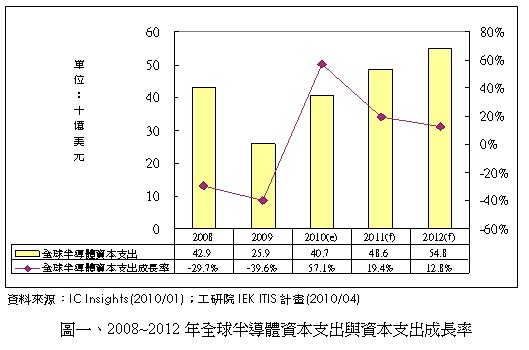 金融風(fēng)暴使得全球廠商皆大幅減少資本支出金額,以保存手中之現(xiàn)金,度過此波不景氣。 2009年全球半導(dǎo)體資本支出為259億美元,較2008年429億衰退39.6%。然而,在看好今年歐美主要消費(fèi)市場需求之復(fù)蘇,以及新興市場需求力道可望持續(xù)下,2010年全球半導(dǎo)體廠商將提高資本支出達(dá)407億美元規(guī)模,較2009年大幅成長57.1%。其中,全球記憶體廠商大幅提高資本支出,以提升其先進(jìn)制程水準(zhǔn),是主要?jiǎng)恿χ弧?br />
