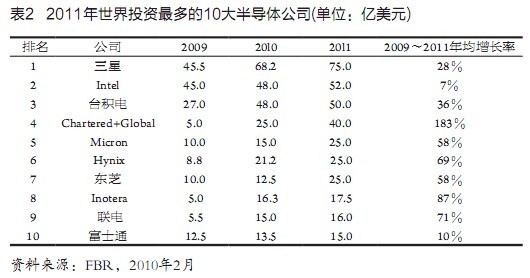又據(jù)FBR市場調研公司發(fā)表的報告,世界半導體業(yè)的總投資額2009~2011年分別為257億美元、406億美元和495億美元,和Gartner公司所報基本相同。該公司又稱,這3年世界最大25家半導體公司的投資,占到整個半導體業(yè)投資的近90%。2009~2011年世界投資最多的l0家半導體公司如表2所示。