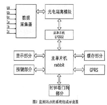 監(jiān)測站點由前端數據采集器和現場下位機構成,其中前端數據采集器采用CS5460模塊和LPC932單片機構成,它負責采集監(jiān)控現場的各項數據并存儲。線路的內部經過嚴格的電磁隔離,測量電路經過采樣、A/D轉換處理后形成的數字信號再經過光電耦合由信號適配器向從單片機LPC932傳送,主單片機與從單片機之間可采用I/O口模擬時序的方式進行串口通信。