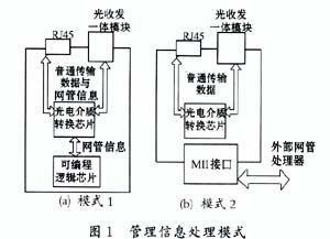 收發(fā)器網(wǎng)管功能的實(shí)現(xiàn)有兩種方式:一種是在收發(fā)器電路板上配置網(wǎng)絡(luò)管理信息處理器——可編程邏輯芯片來處理網(wǎng)管信息,該芯片利用OEMC上的雙向管理指令接口(Managenent Data Input/Output,MDIO)、管理數(shù)據(jù)同步時(shí)鐘輸入接口(ManagenentData Clock,MDC)及被管理信息輸入/輸出管腳等接口來獲取管理信息,管理信息與網(wǎng)路上的普通數(shù)據(jù)共用數(shù)據(jù)通道,如圖1(a)所示。第二種方式如圖1(b)所示,收發(fā)器上沒有管理信息處理器,收發(fā)器外部的網(wǎng)絡(luò)管理者通過MII接口獲取管理信息。可見,有網(wǎng)管功能的收發(fā)器,其元器件種類及數(shù)量遠(yuǎn)遠(yuǎn)多于無網(wǎng)管收發(fā)器,相應(yīng)地,其布線復(fù)雜,開發(fā)周期長(zhǎng)。